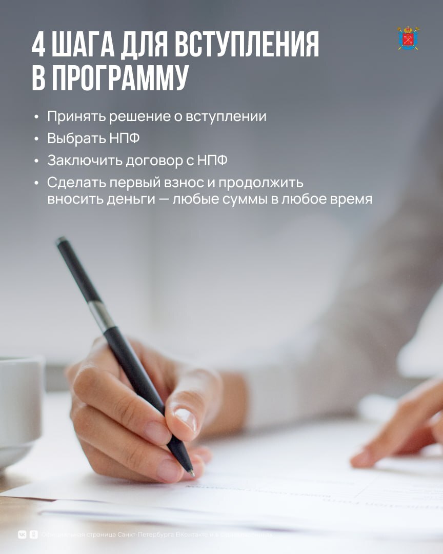 Чтобы начать, нужно выбрать негосударственный пенсионный фонд, заключить договор и внести первый взнос. Полная информация о программе — на сайте: vk.cc/cxhIRI.